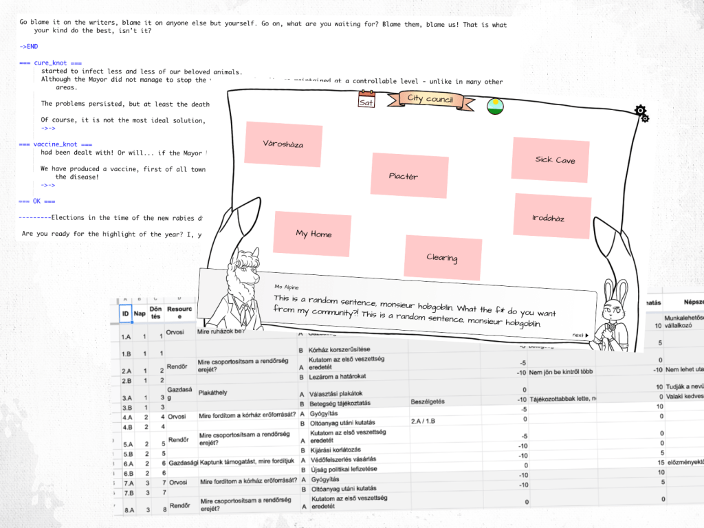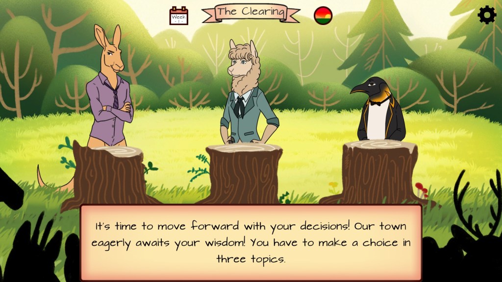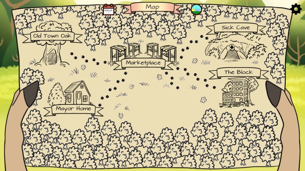 The game consists of 3 phases – 3 weeks -, just before the new elections. Each week you can go to the town, and talk to the townsfolk. The town is reachable through a map, that contains several areas. You can visit three areas per week, then you have to make a decision in three topics presented before you, that are different each week, and either about the upcoming election or the rabies.